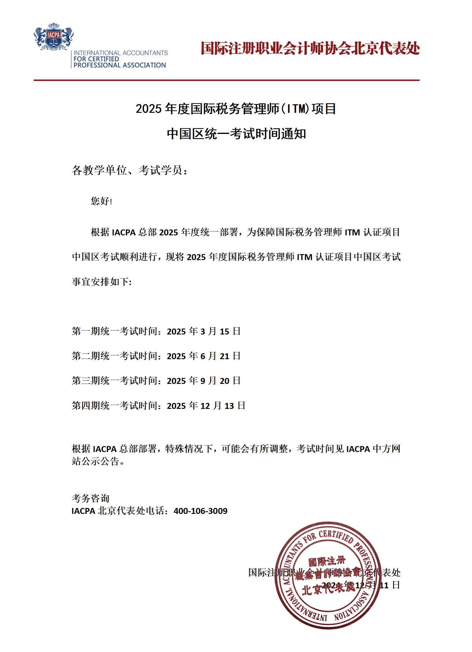 国际税务管理师(ITM)项目2025年度考试时间通知